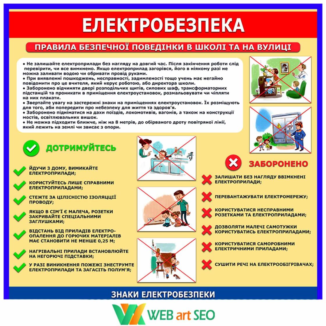 Основні правила поводження з електроприладами передбачають використання лише справної техніки, заборону торкатися дротів чи приладів мокрими руками та обов'язкове вимикання їх із розетки (за вилку, а не шнур) після використання. Не залишайте ввімкнені прилади без нагляду, уникайте перевантаження мережі, не користуйтеся електроприладами у вологих приміщеннях.